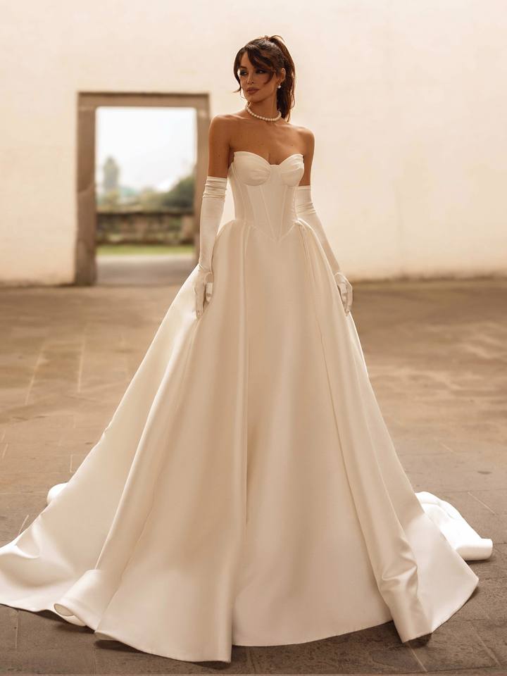 Abito da Sposa Ruolai HL669 con Corsetto Allacciato, Tasche, Tessuto Rigido in Mikado, Stile Basque