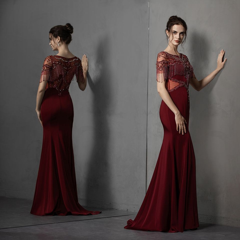 Ruolai PEV-L3138 Luxury Tassel Cap Sleeves Mermaid Crepe Party Prom Evening Dresses Women