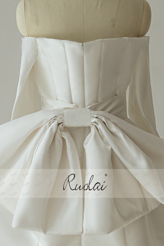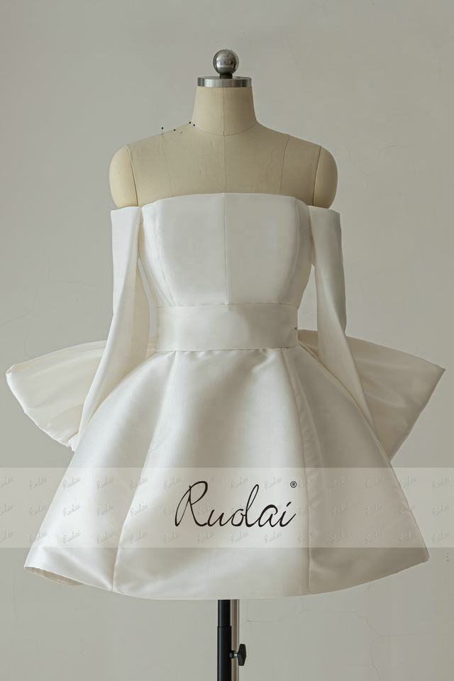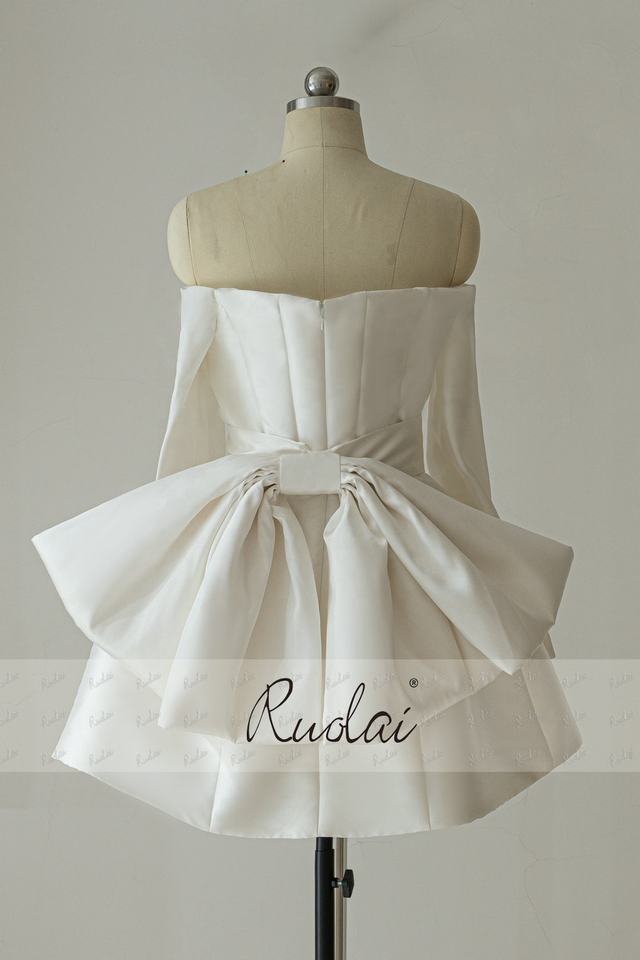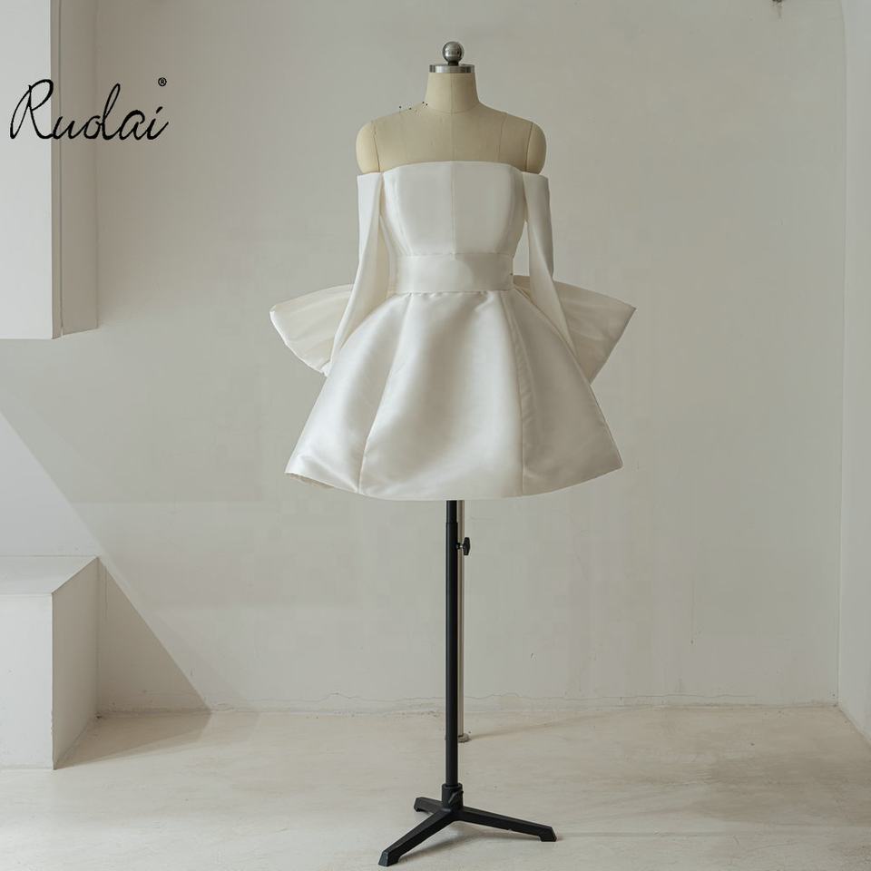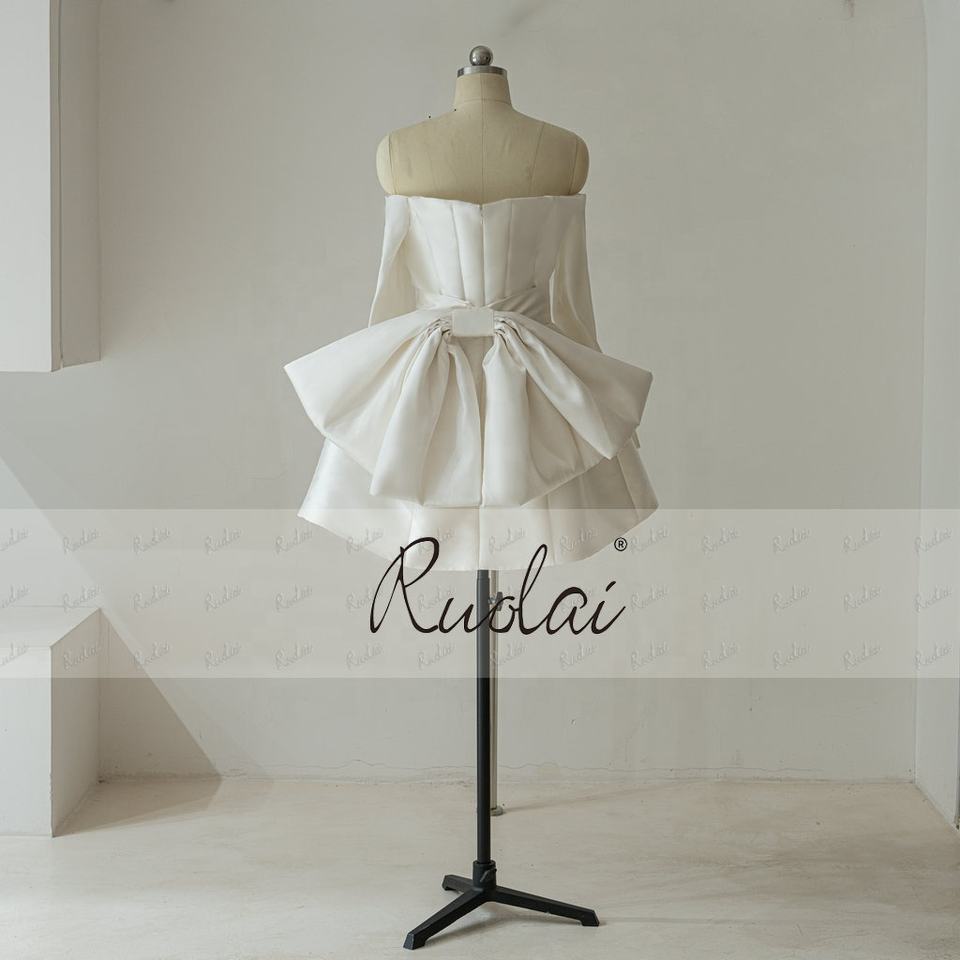 Ruolai QD06325 Mini abiti da sposa a manica lunga in raso per donne con spalline a papillon sul retro abiti da sposa corti