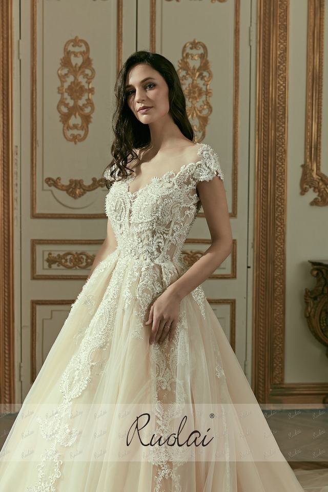 Ruolai ZW01002 Elegant Vintage Cap Sleeve Champagne Cathedral Train Ball Gown Lace Bridal Modest Wedding Dress