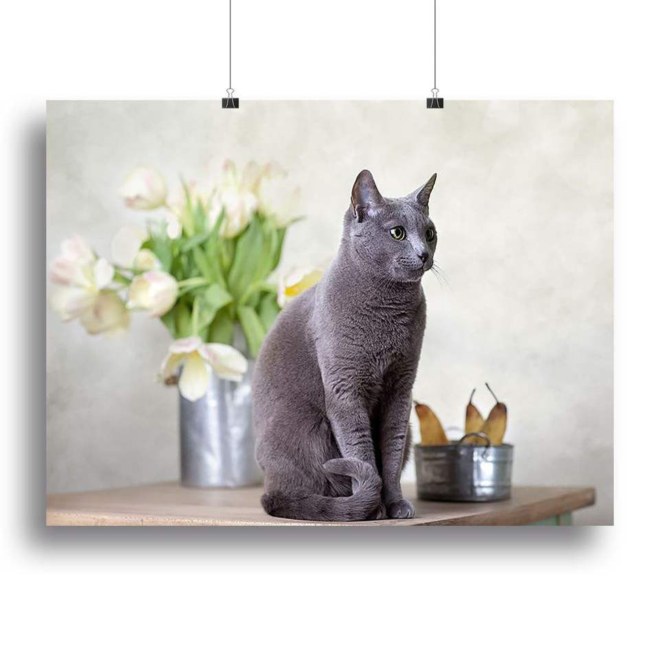 Stampa su Tela o Poster di Gatto Russo Blu Seduto sul Tavolo con Pere e Tulipani per Giochi Interattivi e di Movimento per Animali Domestici