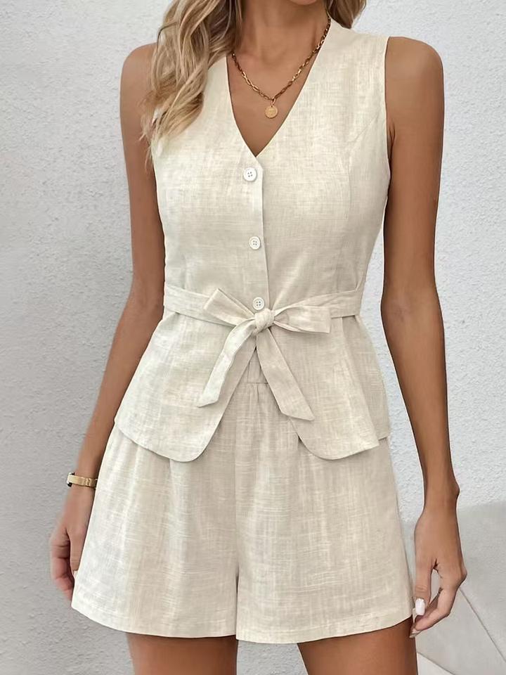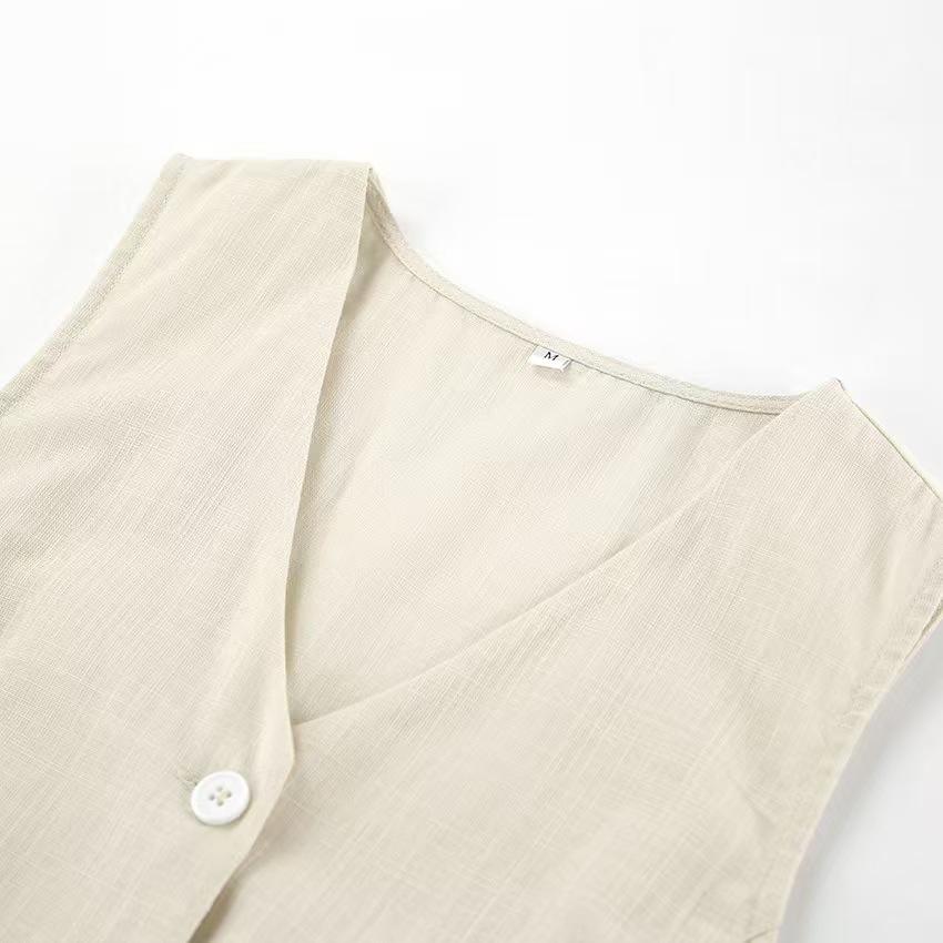 Completo da donna in cotone e lino russo, elegante, con scollo a V, senza maniche, traspirante, estivo, color kaki, due pezzi