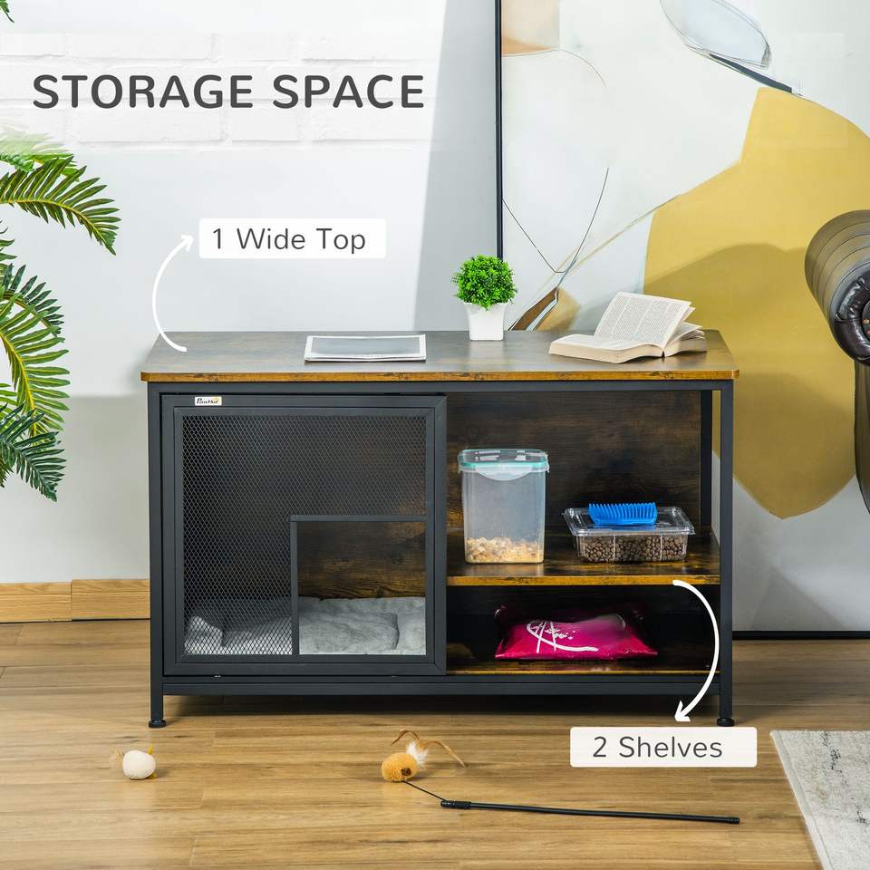 Cuccia Rustica per Cuccioli da Interno in Stile Mobile, Gabbia in Legno per Gatti con Cuscino e Porte Scorrevoli, Tavolino, Casetta per Animali Domestici