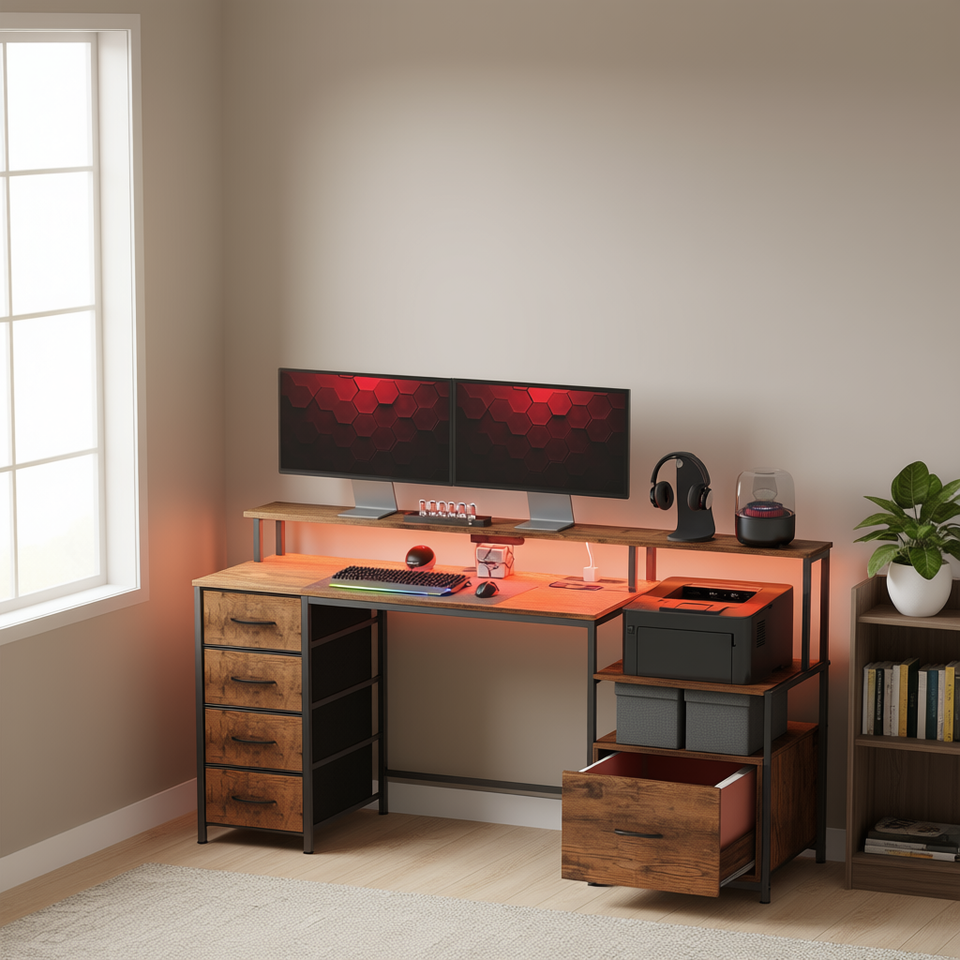 Scrivania per Computer Rustica Marrone 67 con Prese di Corrente, Luci LED, Armadietto Portadocumenti e Cassetti in Tessuto