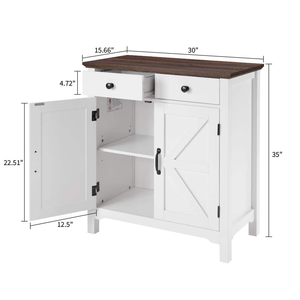 Credenza Rustica Bianca e Marrone Miele Stile Fattoria con Cassetti Regolabili e Anta Scorrevole, Mobile Contenitore con Dettagli Stile Barn Door
