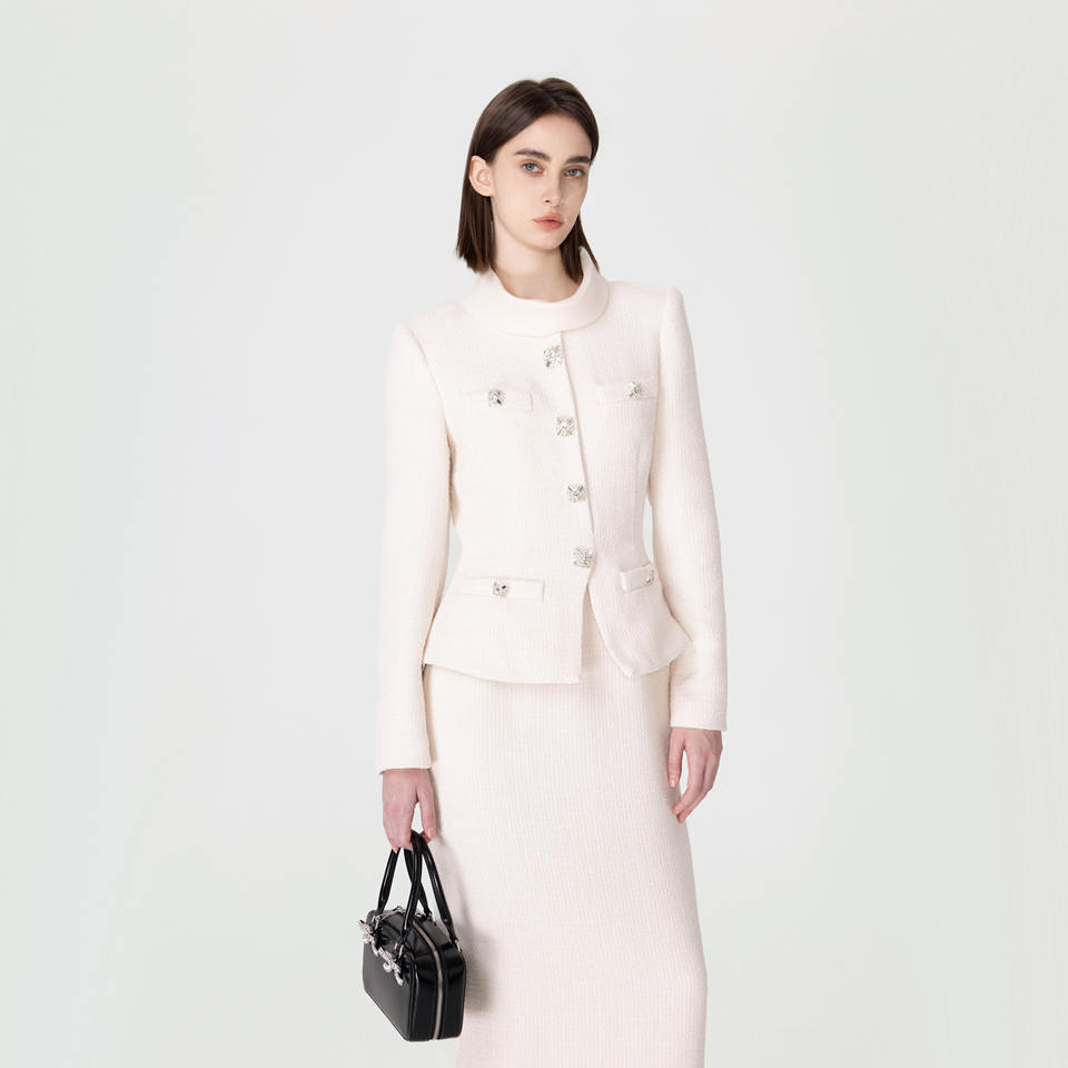 S ~ P Alta Qualità 2026 Nuovo Abito Lungo Primaverile Bianco Avorio a Maniche Lunghe in Tweed dal Temperamento Elegante per Donna