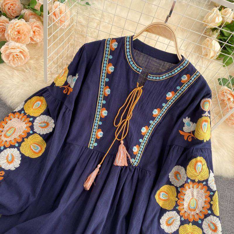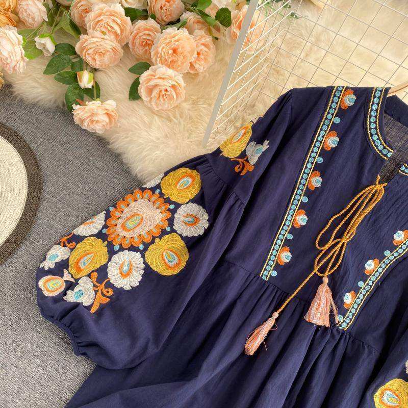 S-XL Bohemian Ethnic Style Cotton Linen Dress Embroidered Vintage Bubble Sleeved Dress Loose Fitting Short Dress