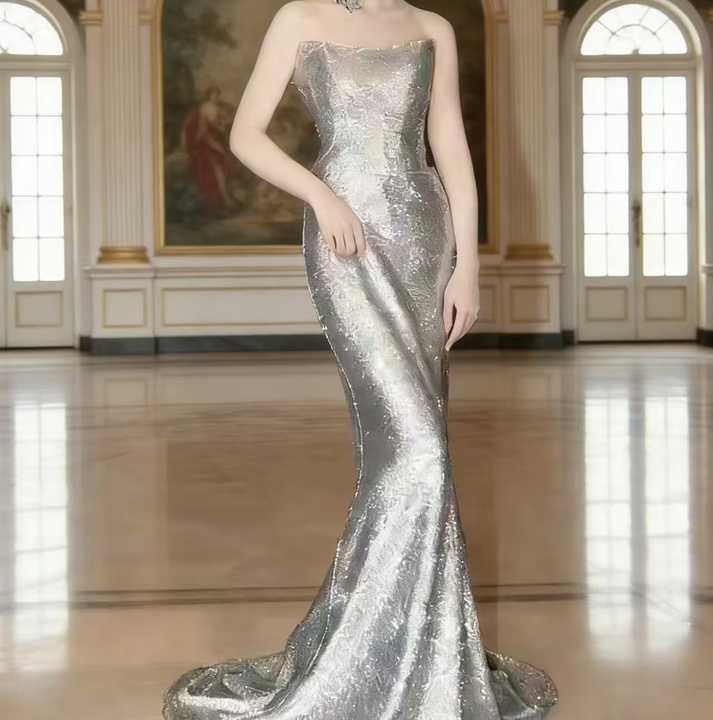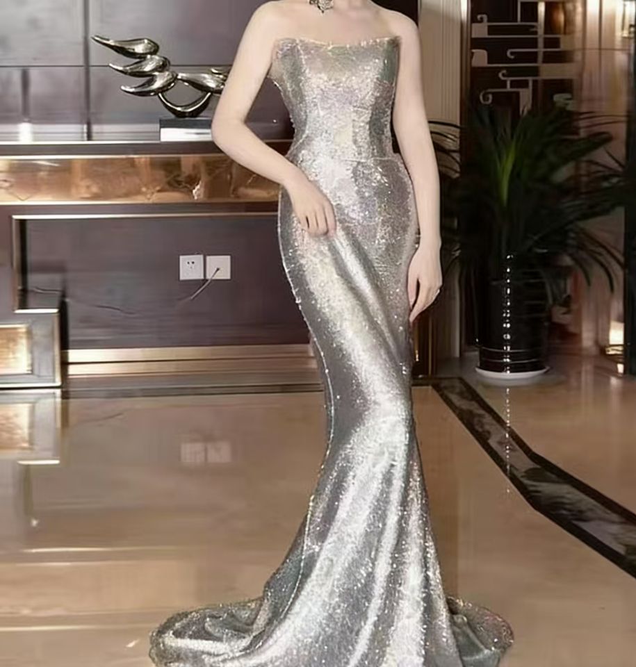 S0081 Nuovo Abito da Sera Lussuoso in Argento Senza Spalline con Paillettes e Strascico Stile Sirena per Serate/Feste