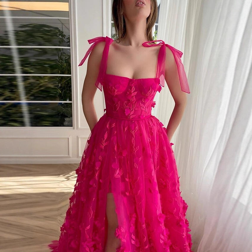S3001L 2026 Nuovo Abito Lungo Elegante Rosa con Spacco Alto, Spalline Sottili e Ricamo - Splendido Abito da Sera
