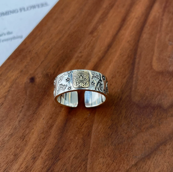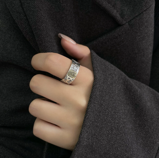 S925 Sterling Silver Heavy-Duty Vintage Zhamo Lamu Ring for Good Fortune, Unisex Minimalist and Versatile Wealth Deity Ring