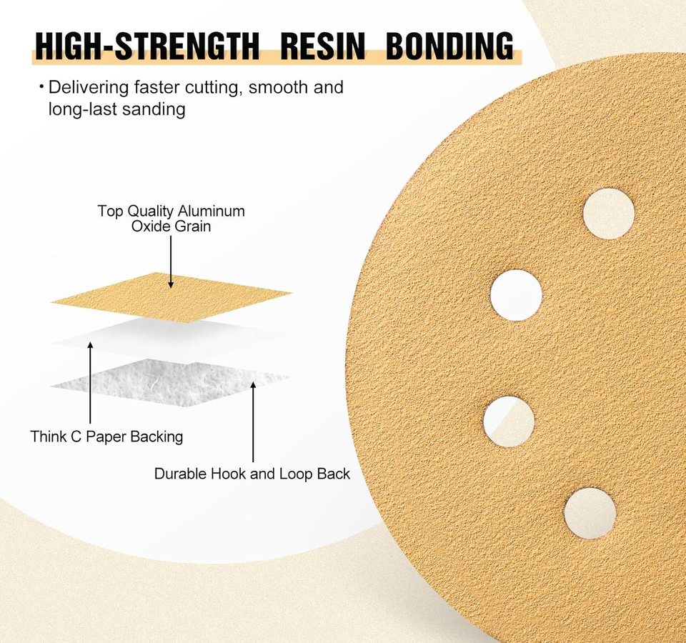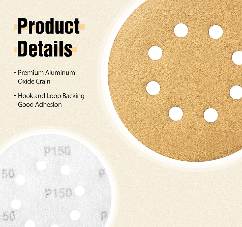 Dischi abrasivi dorati SATC da 5 pollici, con fissaggio a strappo, 8 fori, grana 40-1000 per levigatrice orbitale - Levigatura rapida, personalizzabili per OEM