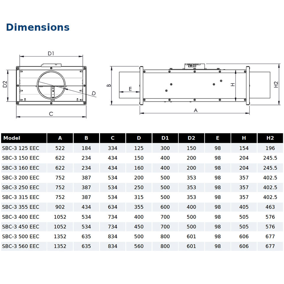 Ventilatore centrifugo SBC-3 355 EEC in scatola a basso profilo con flange circolari, alloggiamento in acciaio zincato, motore EC, classe IP44 B; Gamma