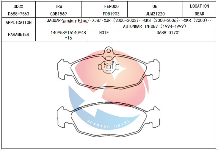 SDCX Brake Pad D688-7563 / D1701-8925 / GDB1569 / SP2024 for ASTON MARTIN DB7 Vantage /JAGUAR Vanden Plas
