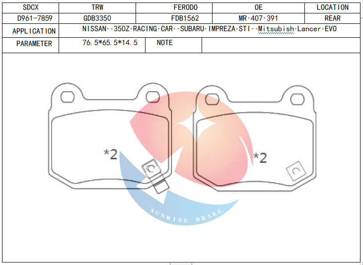 La posizione della pastiglia del freno SDCX è dell'asse posteriore D961-7859 / D1309M per SUBARU Impreza / NISSAN 350 / MITSUBISHI LANCER
