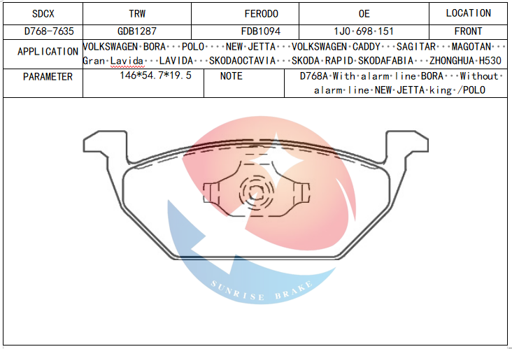 D768A, 23130, 3501082, DB1387, gdb1357, 1J0698151C, 6C0698151A, 1K0698151A, 1J0698151E, 1J0698151A, GDB1287, 180698151, 224745
