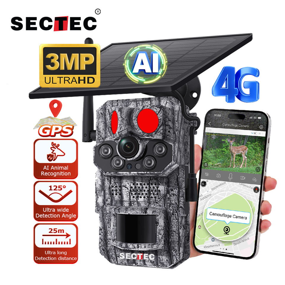 Fototrappola Cellulare SECTEC 3MP 4G LTE a Energia Solare per Fauna Selvatica Senza Flash Visibile con Tracciamento GPS per la Caccia