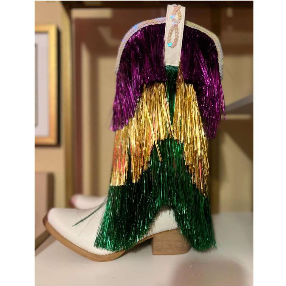 SHIKOL Mardi Gras Boots Cowboy Women Fringe Sparkly Purple Gold Green Knee High Leather Pointed Toe Custom Western Cowgirl Boots