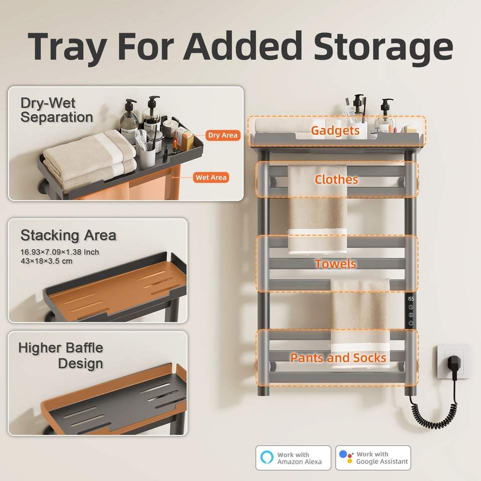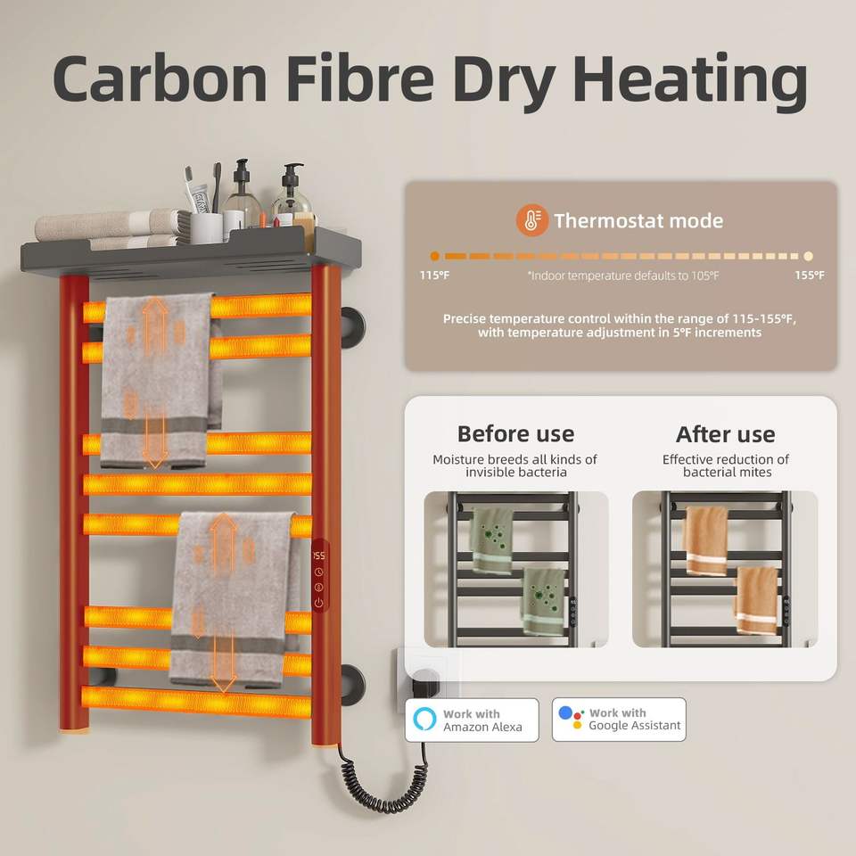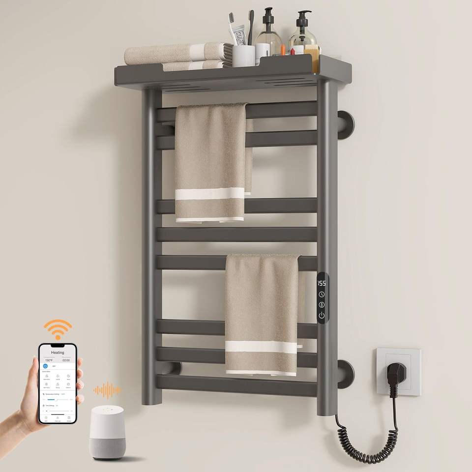 SIOYIE Scaldasalviette Elettrico da Parete a 8 Barre con Controllo Wi-Fi tramite App, Timer Regolabile e Ripiano