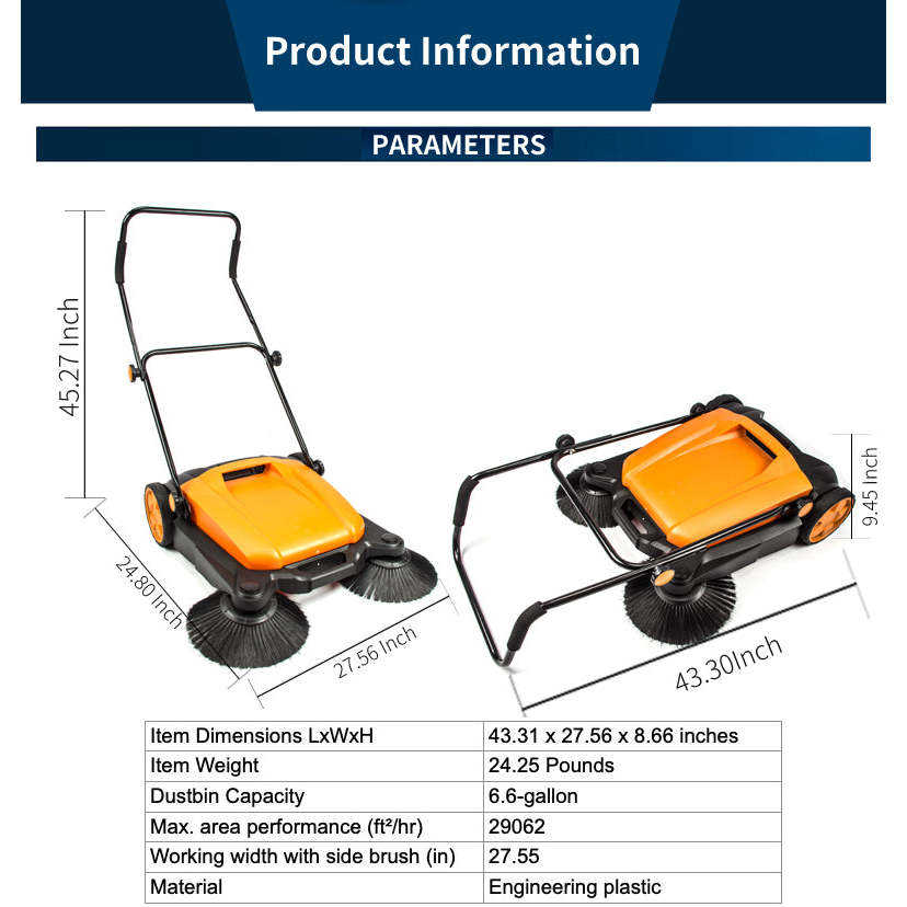 SM650 27.5 Manual Push Powered Floor Sweeper Triple Brushes 6.6 Gallon Dustbin 29,000 Sq Ft/h Efficiency Indoor/Outdoor Use