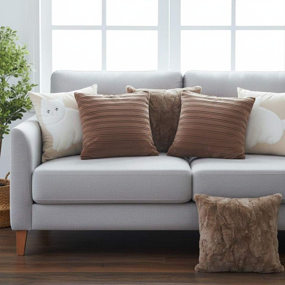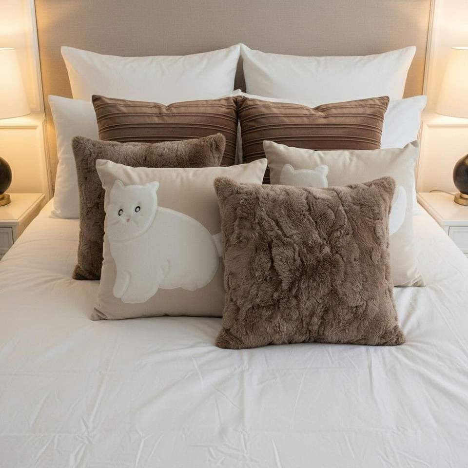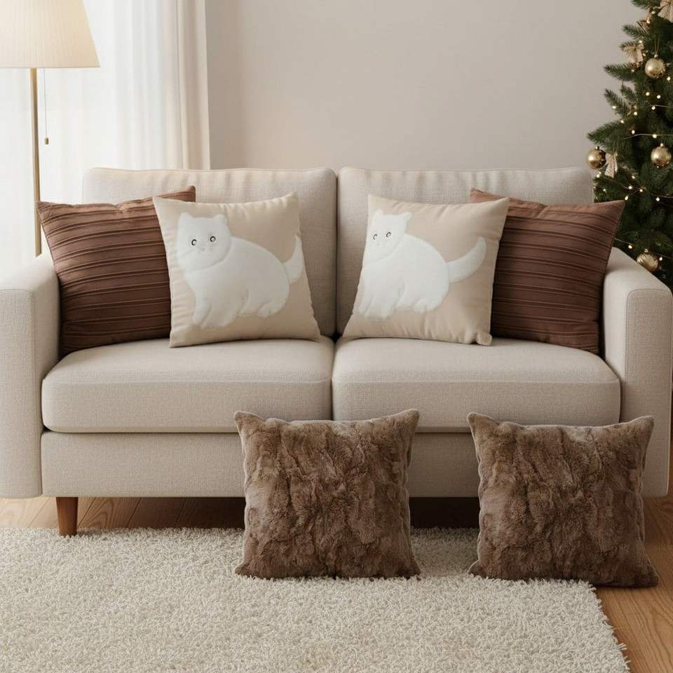 Set di 5 Federe Decorative SOGA in Peluche Marrone, Finta Pelliccia, Effetto Pelle Ruggine e Silhouette di Gatto