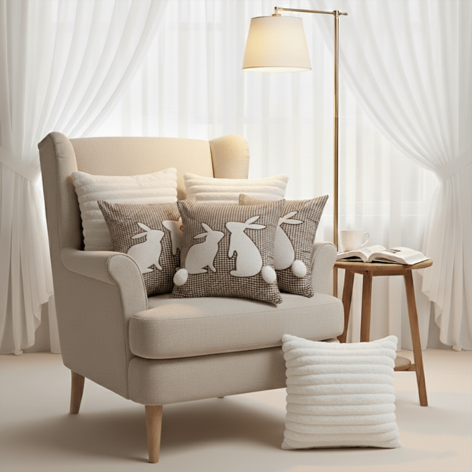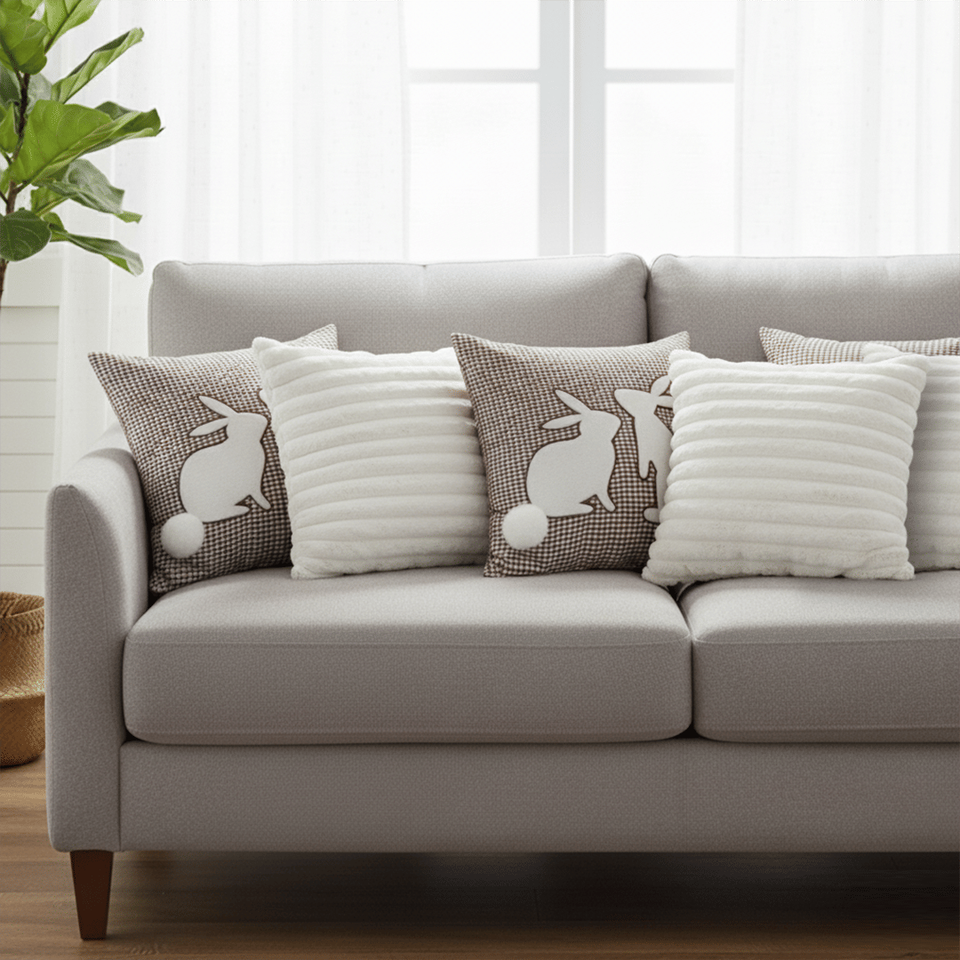 Set di 6 fodere per cuscini SOGA, 3x 45cm con motivo a quadretti marrone e coniglietto, e 3x 45cm eleganti cuscini decorativi e da divano bianchi testurizzati