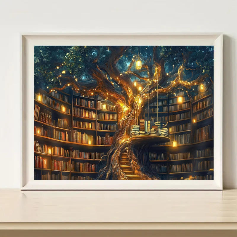 SONGWOOART 5D DIY Diamond Painting Custom Beautiful Scenery for Adults Tree in the Bookstore Full Drill Diamond Art Painting