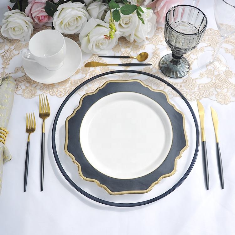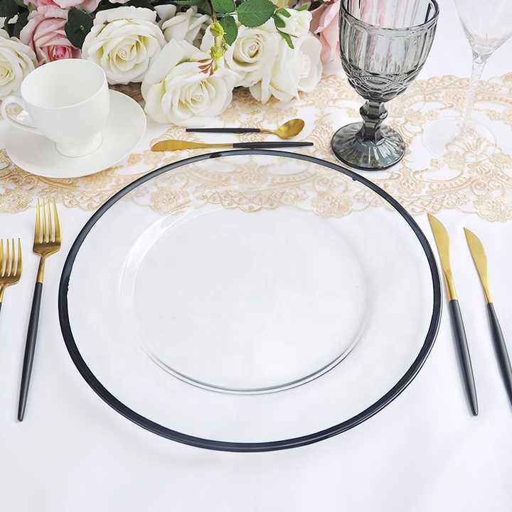 clear charger plate with black trim