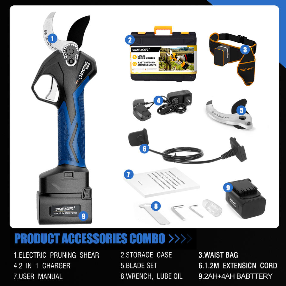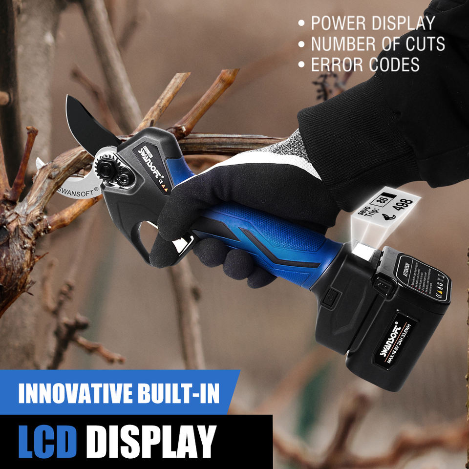 SWANSOFT Forbici da Potatura Professionali a Batteria da 36mm con Taglio Progressivo, Autonomia 6-8 Ore per Vigneti e Frutteti PRU36