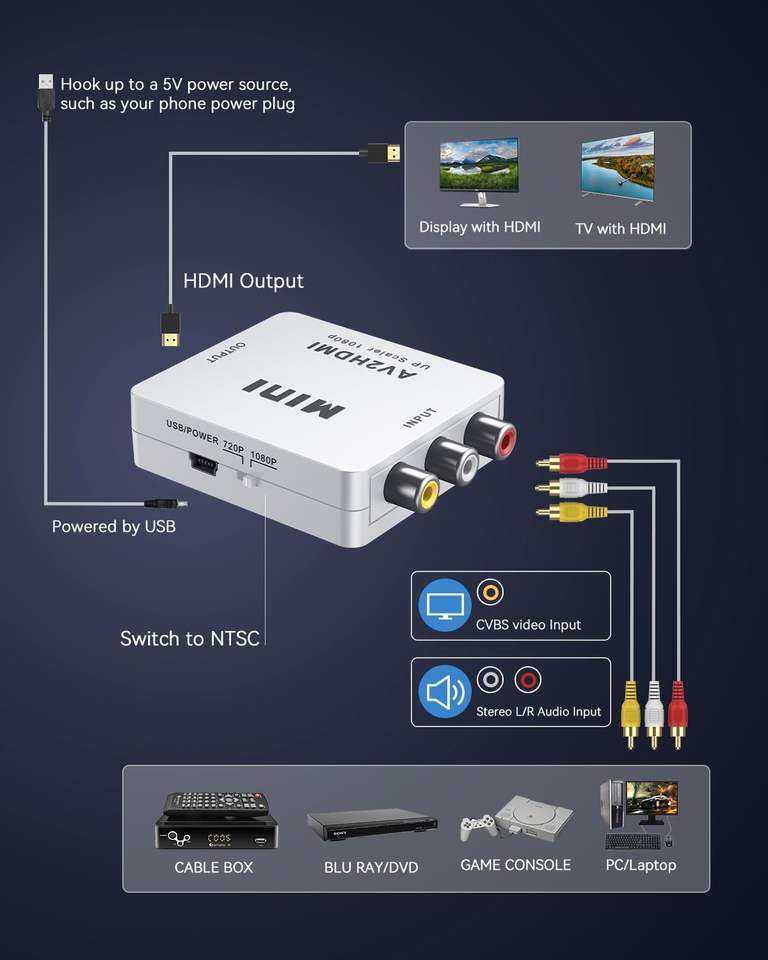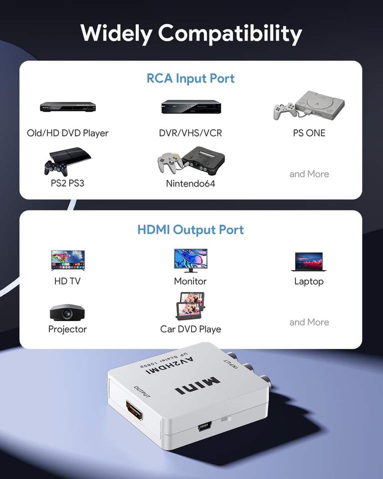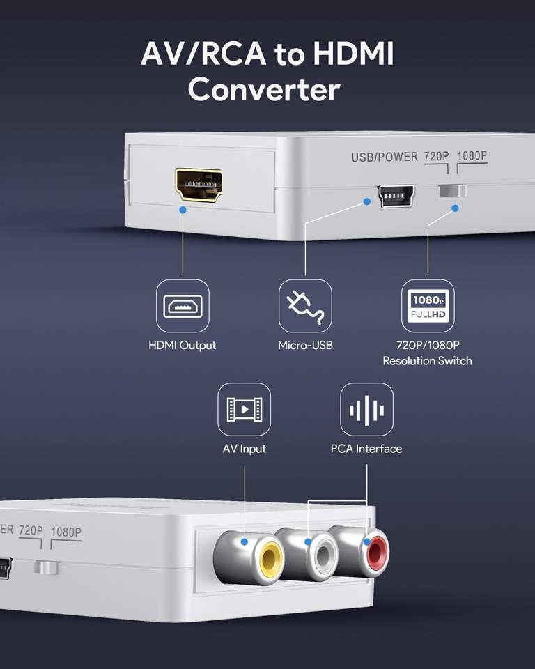 Convertitore SYONG da RCA a HDMI AV2Hdmi 1080P, Adattatore Video Audio da RCA Composito CVBS AV a HDMI con Cavo Mini USB per TV/DVD