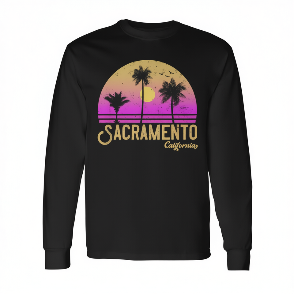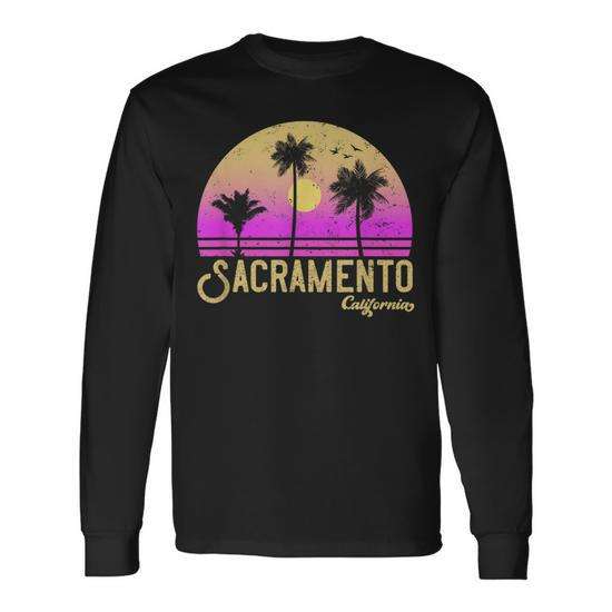 T-shirt a maniche lunghe Sacramento California Retro Sunset con design vintage con palme