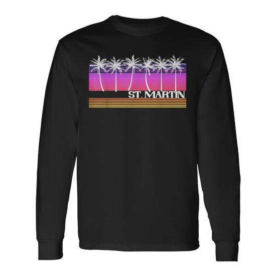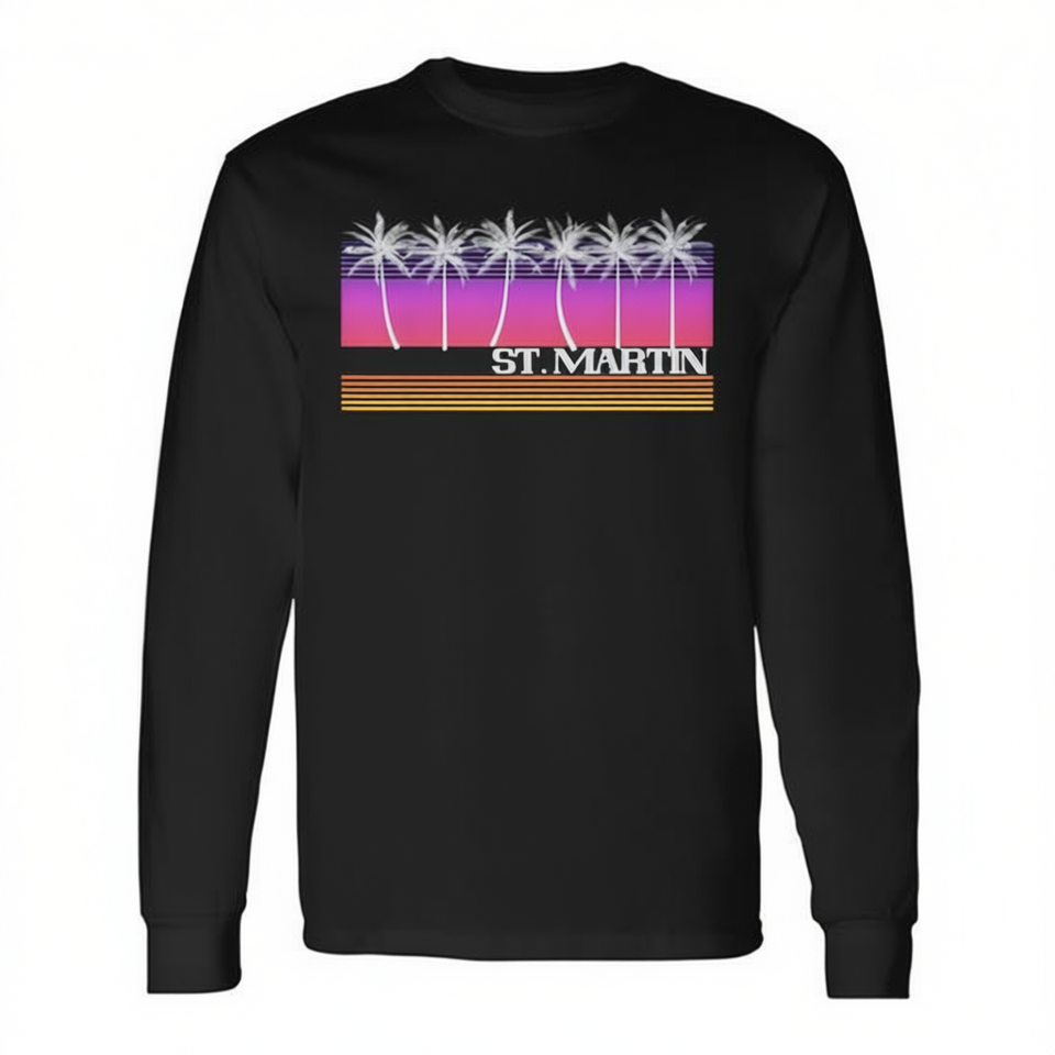 T-Shirt Vintage Caraibica a Maniche Lunghe con Tramonto sulla Spiaggia di Saint Martin, Prodotto Promozionale