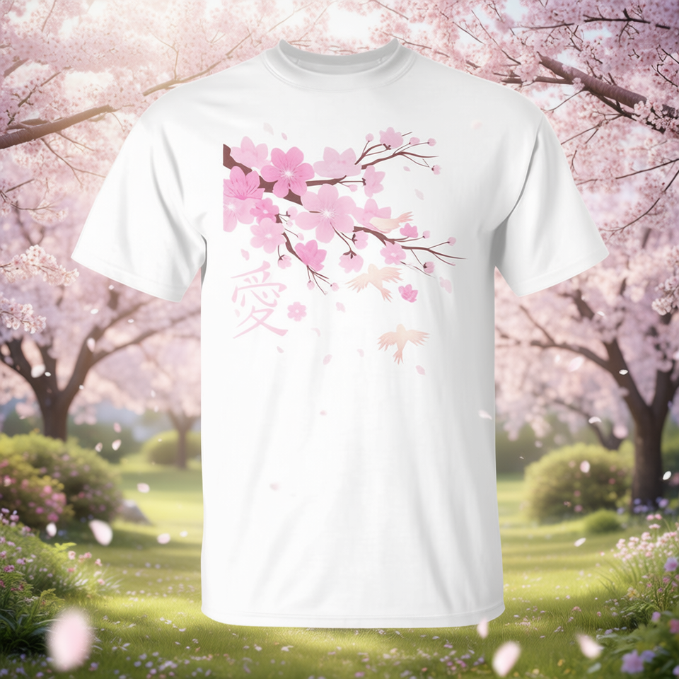 T-shirt Premium con Ramo di Ciliegio Sakura e Simbolo dell'Amore Giapponese, Unisex, Girocollo, Manica Corta, Stampa Digitale