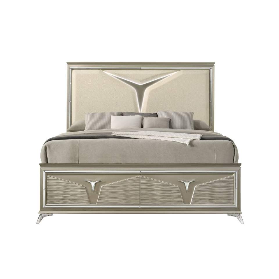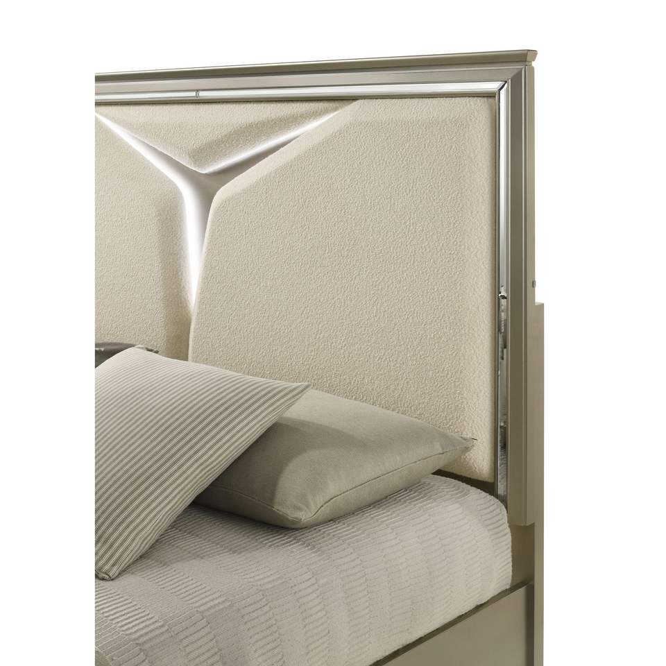 Letto matrimoniale moderno Samantha con testiera a LED, in legno resistente e design imbottito