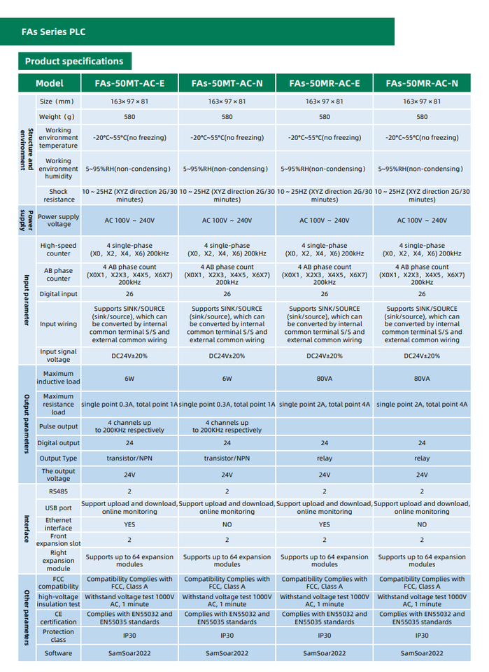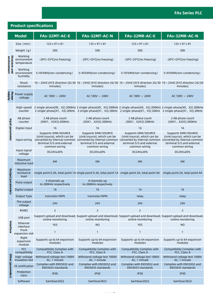 Samkoon PLC FAs Series FAs-32MR-AC-E/FAs-20MT-AC/FAs-32MT-AC-N/FAs-40MT-A 16/20/22/32/40/50/66MR/MT-AC-E Modbus RS485 Industrial