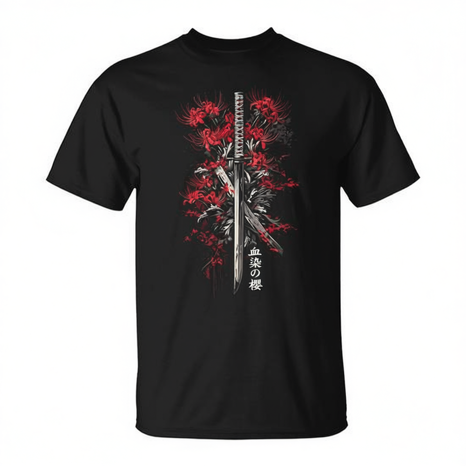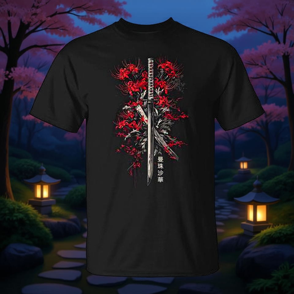 T-Shirt Promozionale Samurai Katana Anime Giapponese Otaku con Fiore di Giglio Ragno Rosso