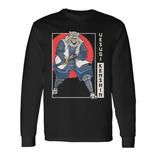 Maglietta a maniche lunghe Samurai Uesugi Kenshin con design da guerriero anime, maglietta da uomo nera con scollo rotondo