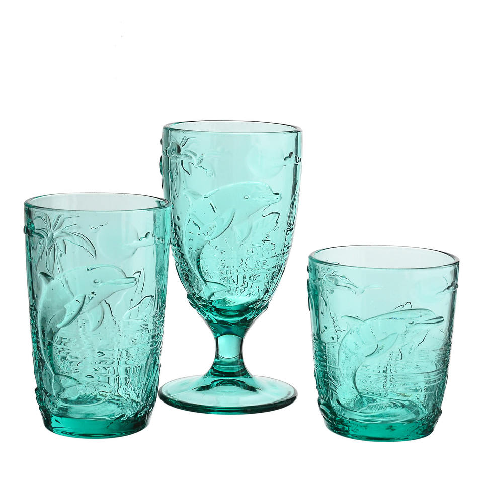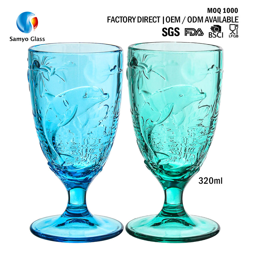 Calici in Vetro Blu Pressato Personalizzati Samyo, Bicchieri da Vino Rosso Vintage con Motivo a Delfino in Rilievo e Stelo Corto
