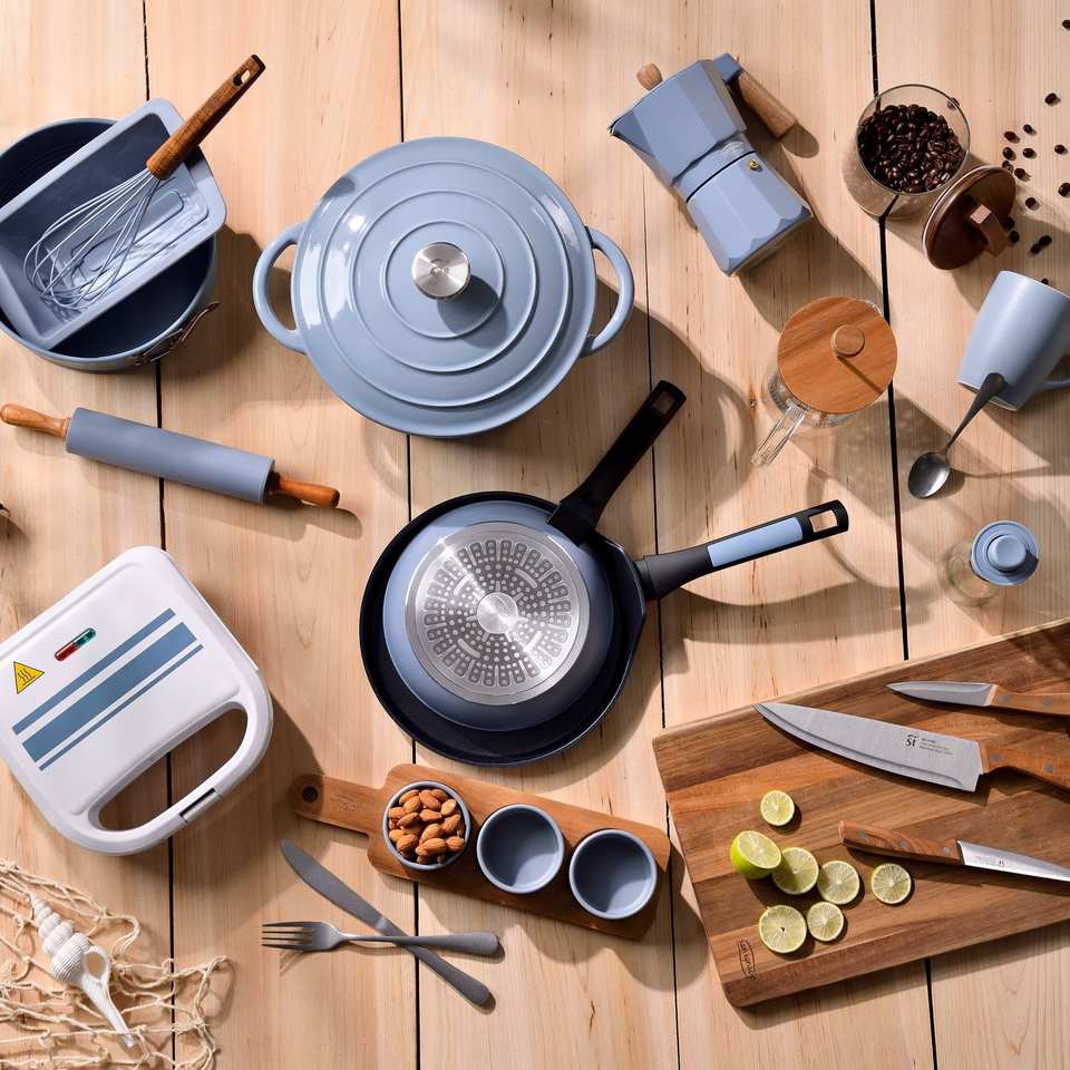 Set di 3 padelle San Ignacio 16/20/24 cm + set di 5 utensili da cucina in silicone e legno di acacia