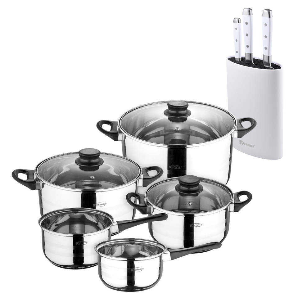 Set di Pentole San Ignacio+ Bergner NATURALLY in Otto Pezzi, 3 Coltelli in Acciaio Inox + Blocco in Bianco