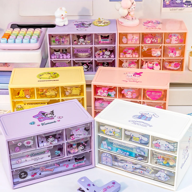 Sanrio 6 Grid scatola portaoggetti Desktop tipo cassetto trasparente scatola organizzativa portapenne invia Kuromi Melody Cinnamoroll adesivi
