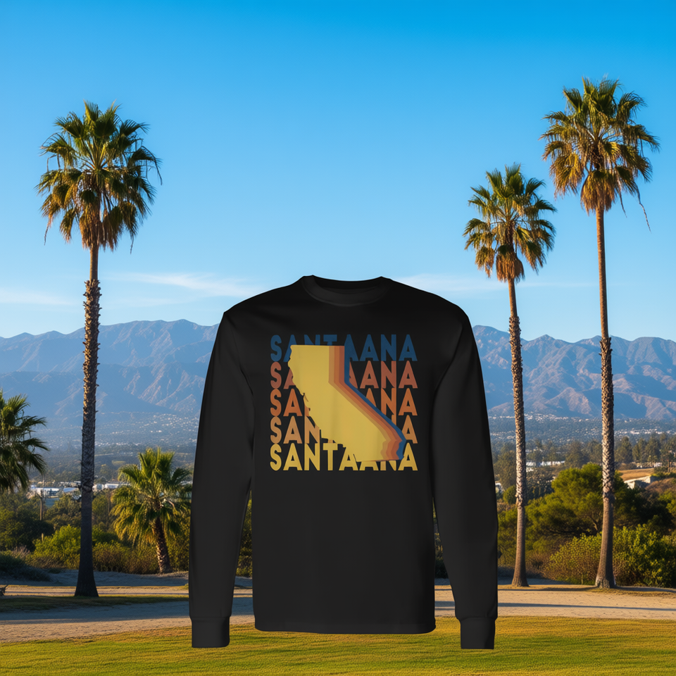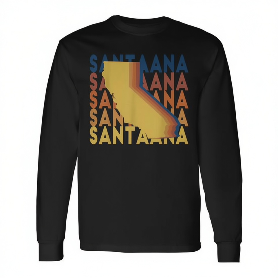 T-shirt retrò a maniche lunghe Santa Ana California con design ripetuto, abbigliamento da uomo