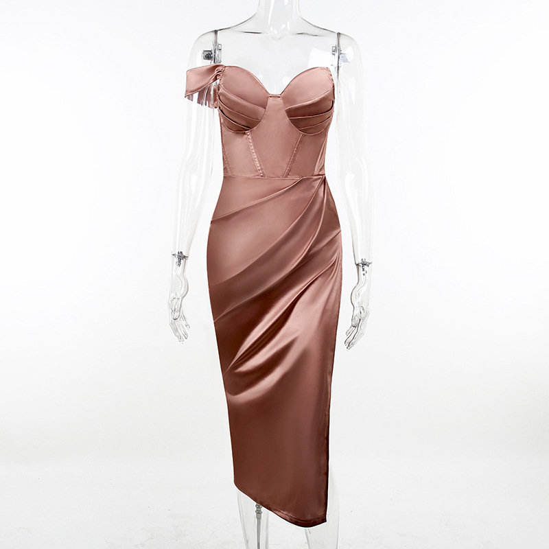 Abito da sera aderente in raso con spacco sulla coscia, elegante e sexy