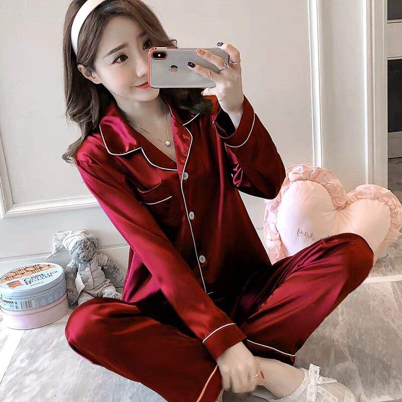 Satin Woman Pajamas Two Pieces Long Sleeve Red Heart Printed Women Pajamas Set