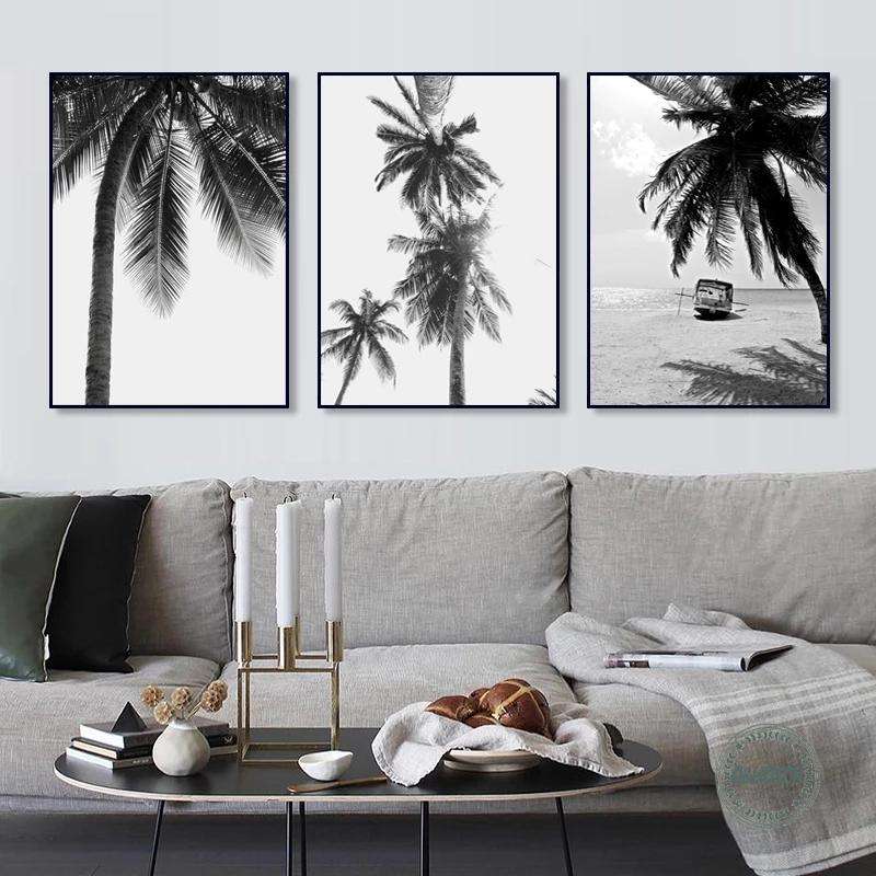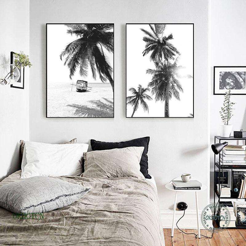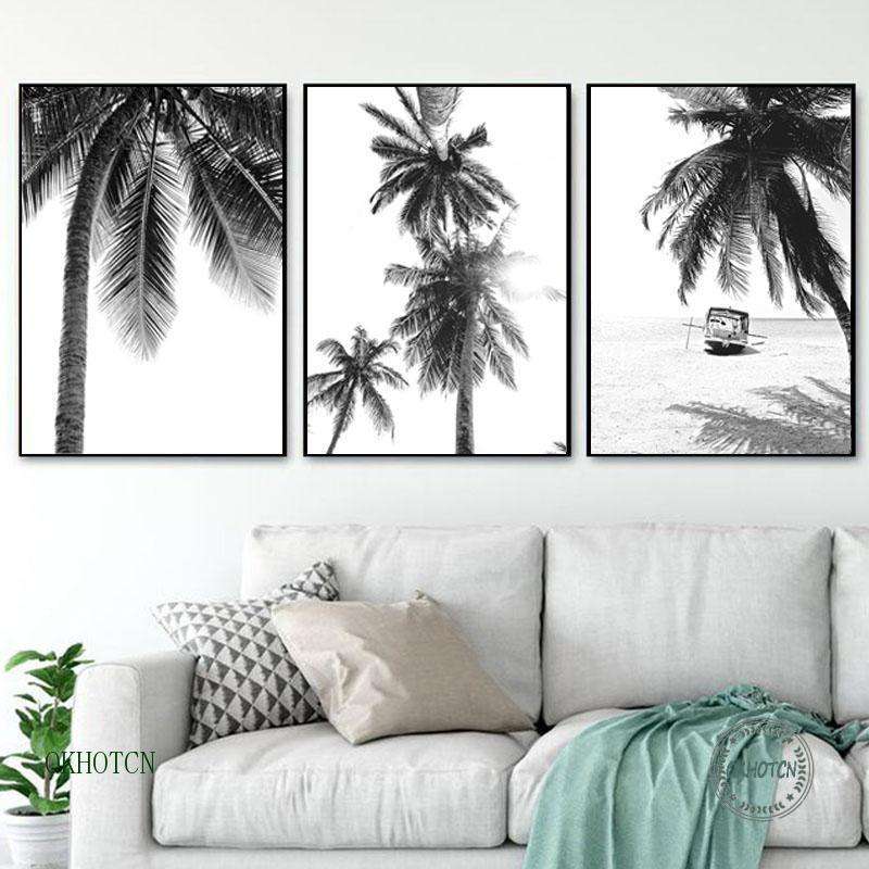 Scandinavian Modern Art Black and White Tropical Plant Palm Tree Beach Decoration Painting Canvas Poster With Frame