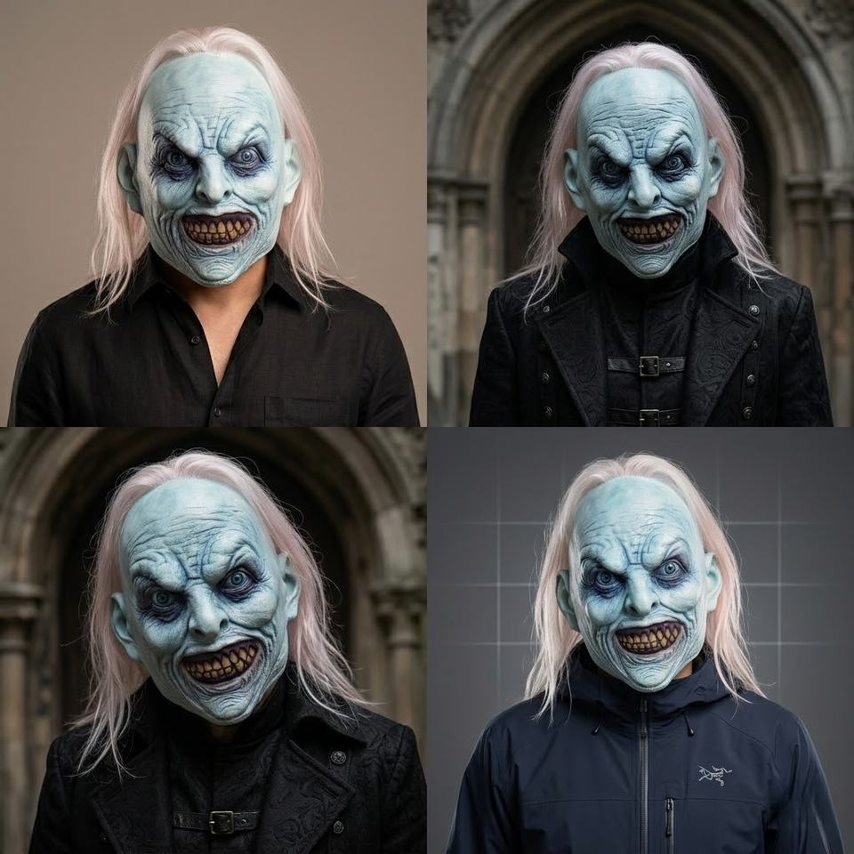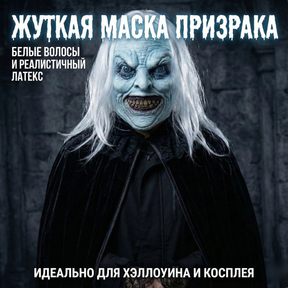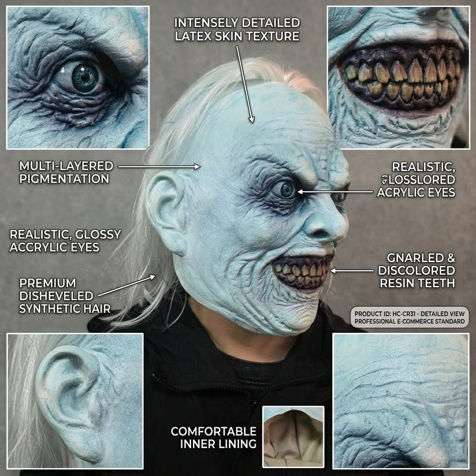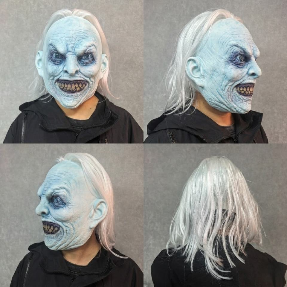Maschera in Latex Blu Demone Spaventoso con Capelli Bianchi, Accessorio Horror per Costume di Halloween e Feste a Tema