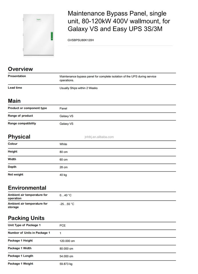 Schneider GVSBPSU80K120H Maintenance Bypass Panel Single Unit 80-120kW 400V Wallmount for Galaxy VS and Easy UPS 3S/3M