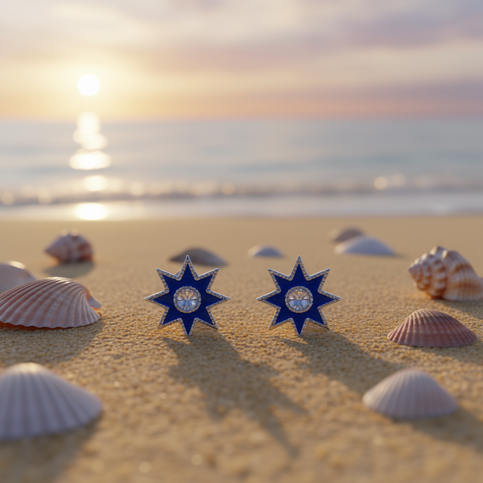 Sea Blue Star Stud Earrings With White Stone Bezel Setting For Women Fashion Jewelry