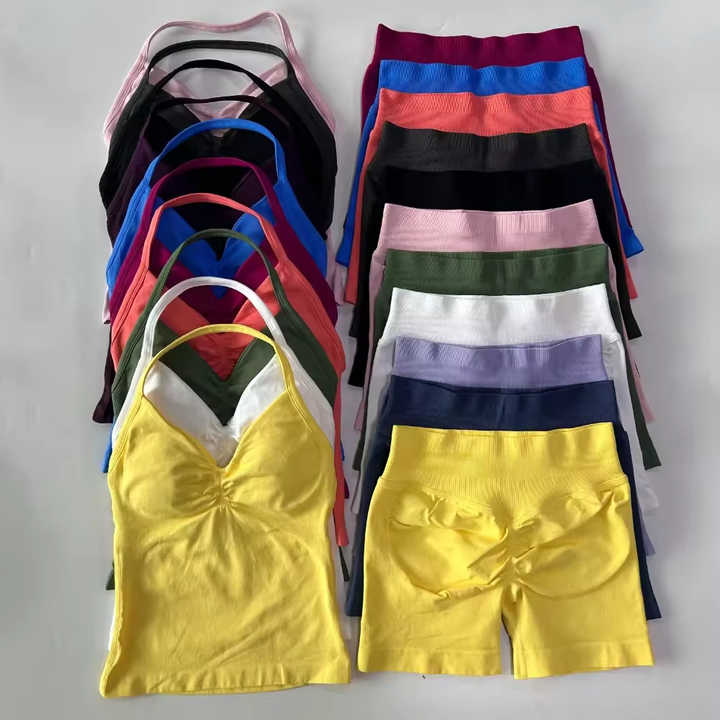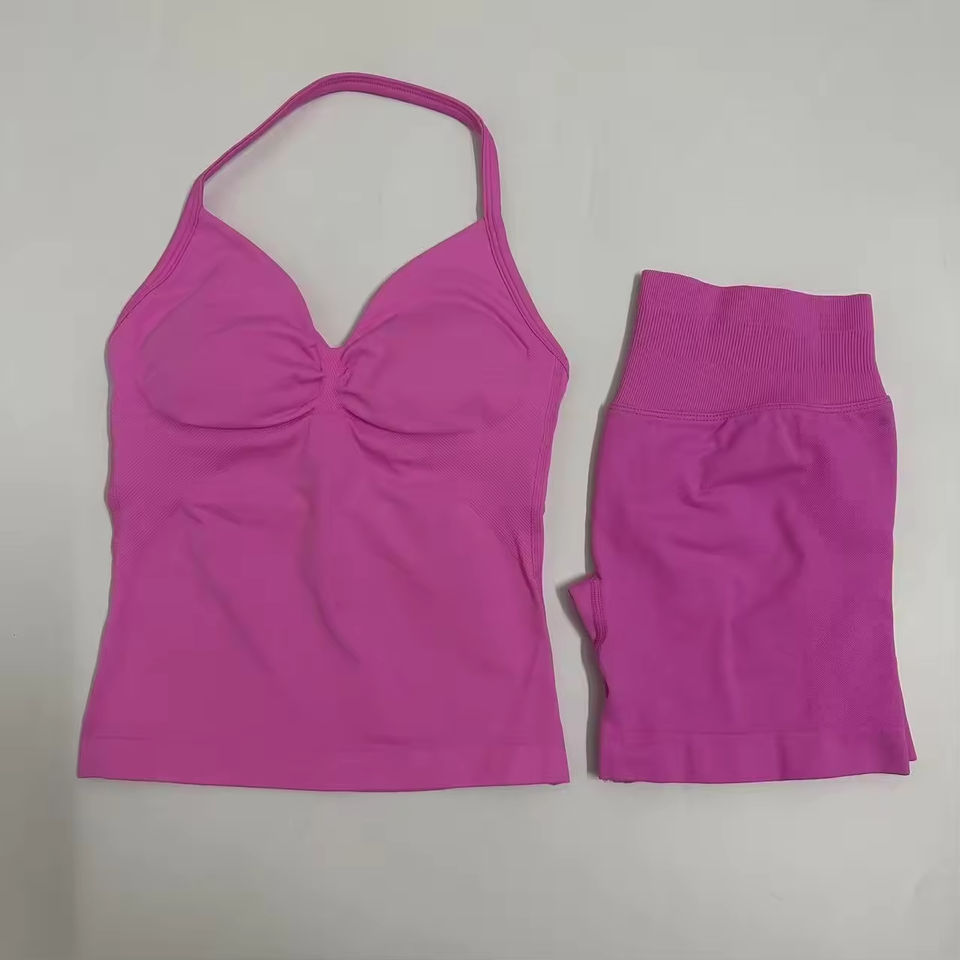 Completo Sportivo Estivo da Donna Senza Cuciture, Top Imbottito Halter con Arricciatura e Pantaloncini Modellanti, Set da Palestra per Allenamento