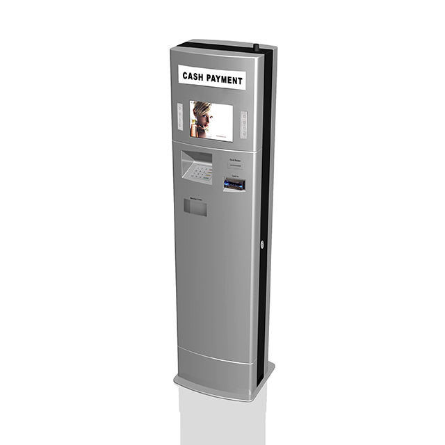 Chiosco Self-Service con Schermo Touch Curvo per Pagamenti Cashless e in Contanti con Lettore di Codici a Barre SDK e Funzioni di Cambio Valuta