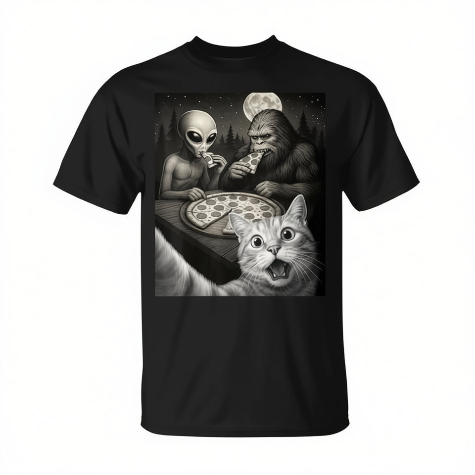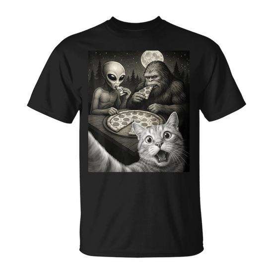 Selfie di un gatto con Bigfoot che mangia pizza con una maglietta aliena